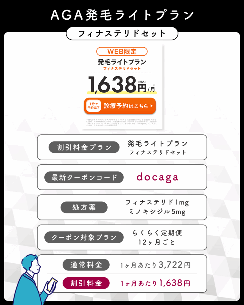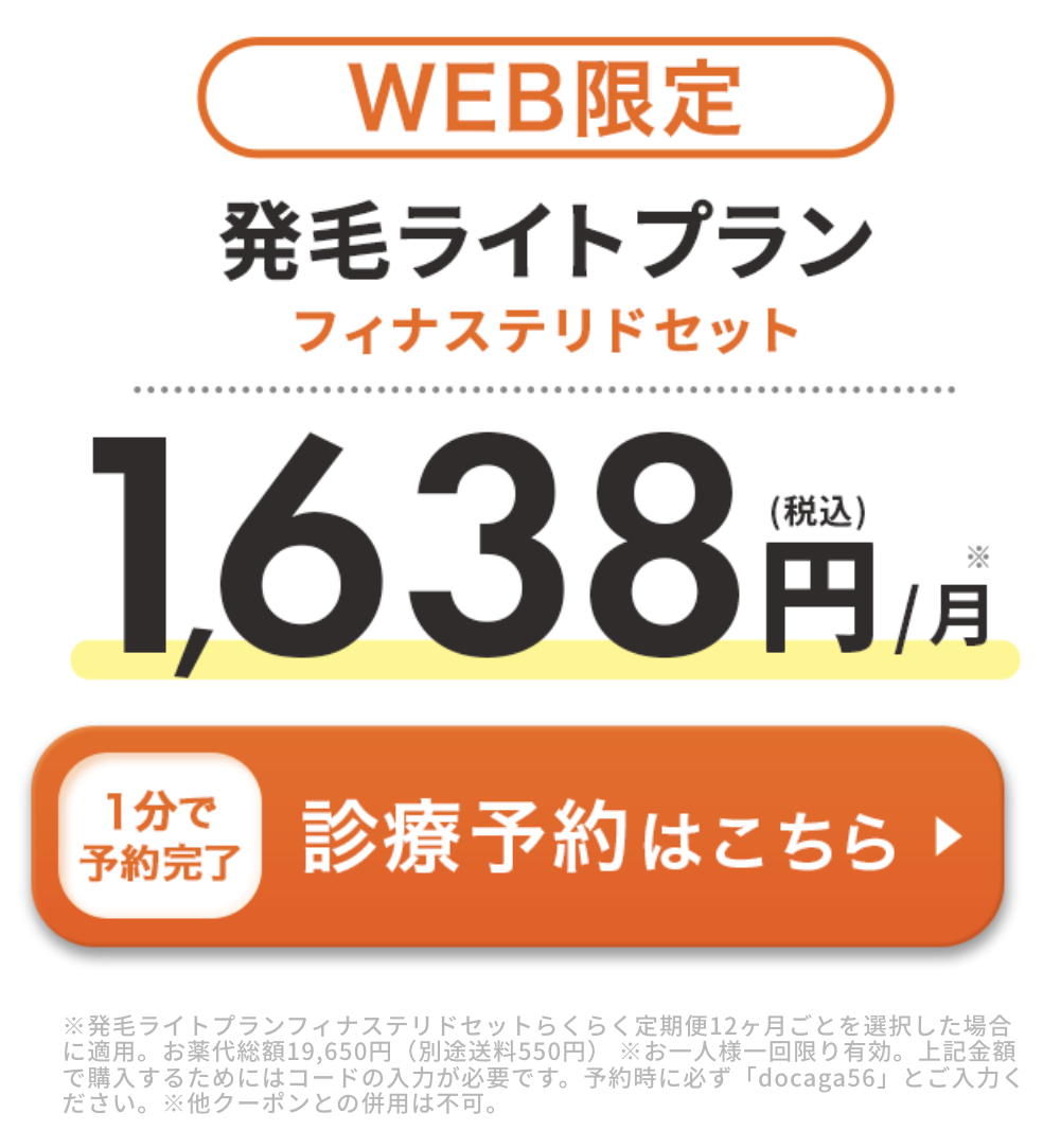 | AGA発毛ライトプランフィナステリドセット(※2) | docaga | 総額:44,660円 1ヶ月あたり:3,722円 →総額:19,656円 1ヶ月あたり:1,638円 |